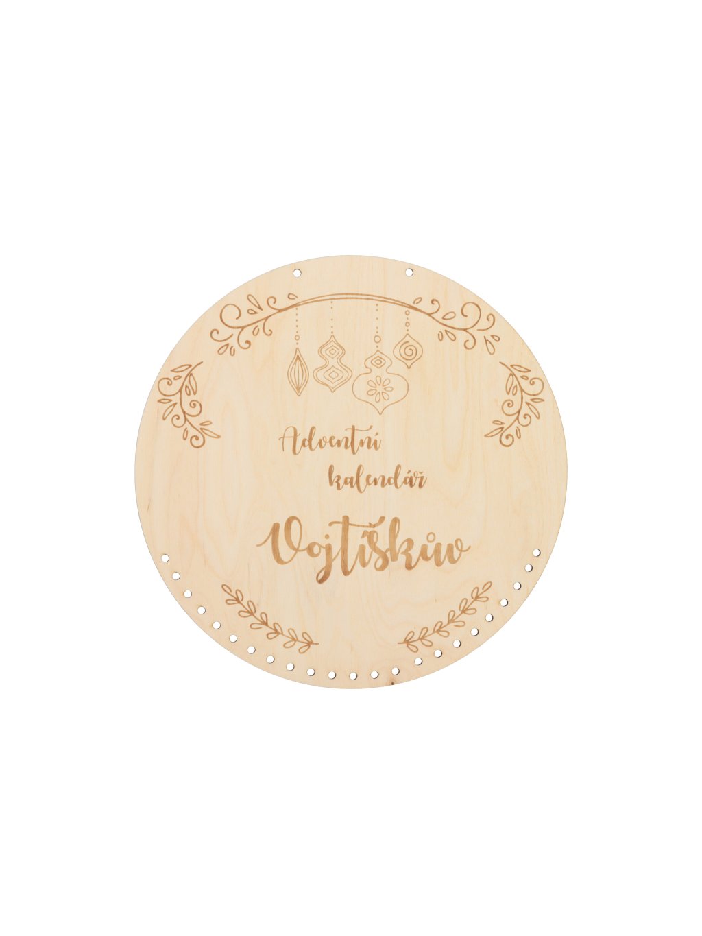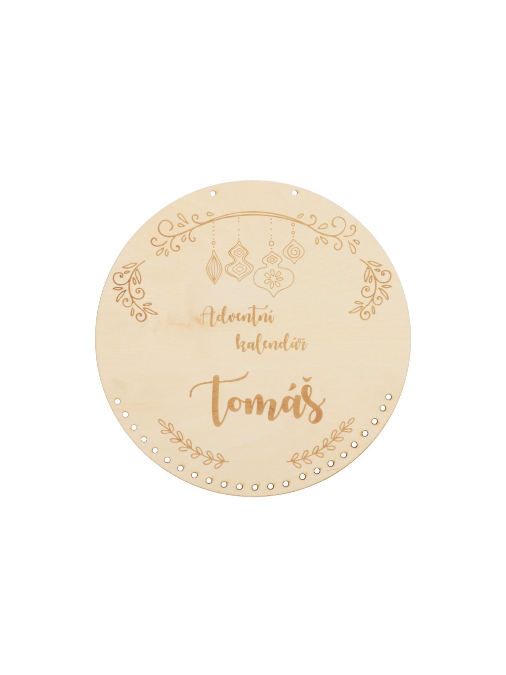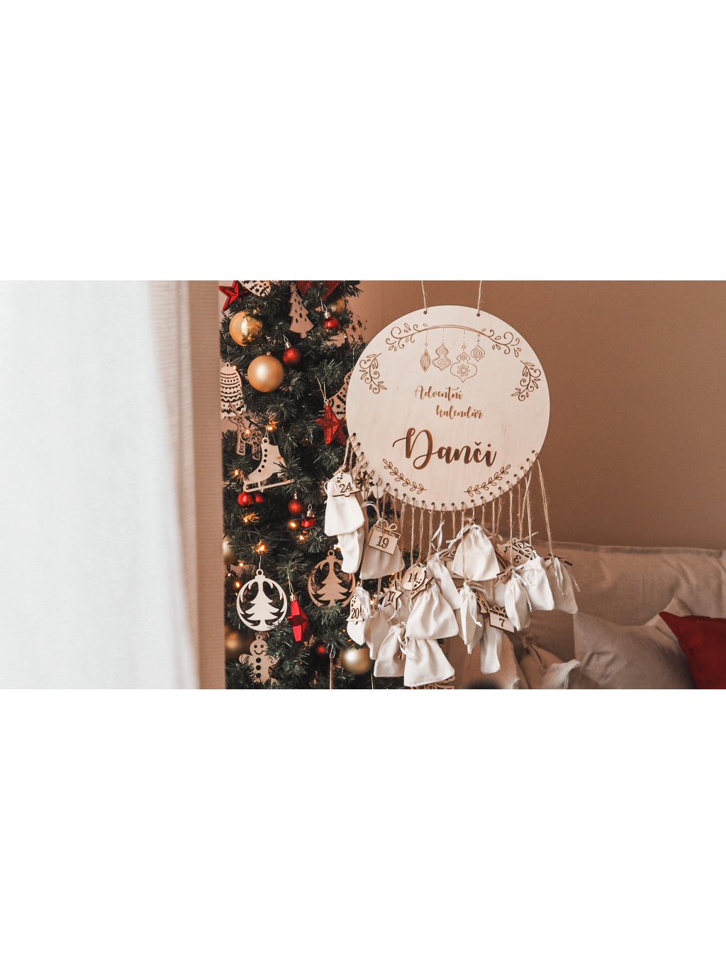 Adventní kalendář je vyrobený z přírodní překližky o šířce 3 mm, s vypálenými vánočními motivy a jménem dítěte na míru (jméno zadejte do textového pole).