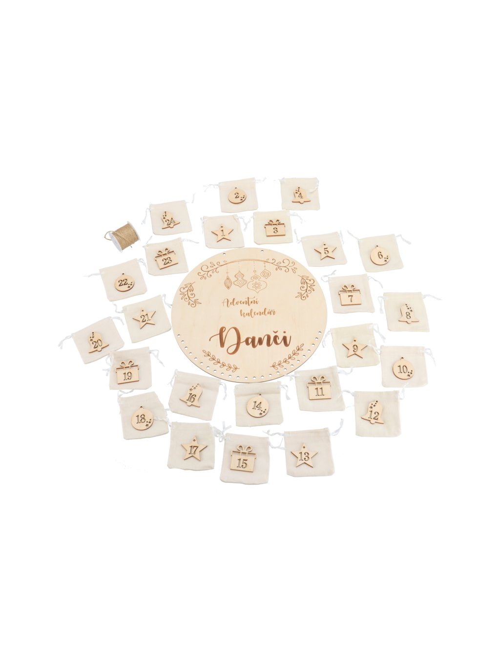 Kalendář je určený pro svépomocnou montáž. Sada obsahuje dřevěný kruh (průměr 30 cm), 24 dárkových bavlněných pytlíčků, přírodní provázek a přívěsky očíslované od 1 do 24.