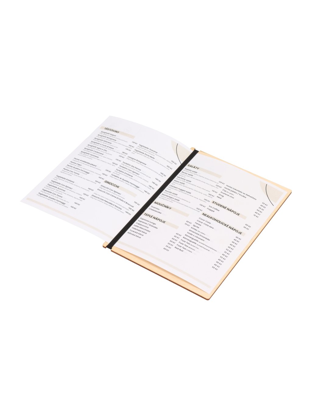 Jídelní lístek stačí vytisknout a vložit za pevnou gumu. Když se zašpiní nebo poškodí, mužete ho ihned vyměnit za nový, takže každý zákazník dostane elegantní kartu menu.