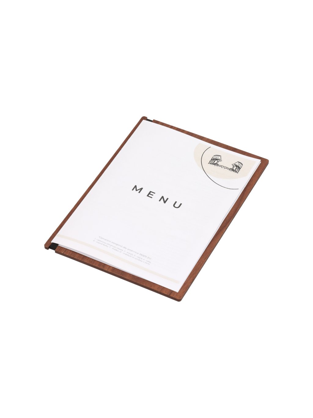 Dřevěná deska na menu A4 z překližky amerického ořechu nejenže na stole vypadá skvěle, ale je také velmi praktická, lehká a nezabírá tolik místa jako tradiční jídelní lístky.