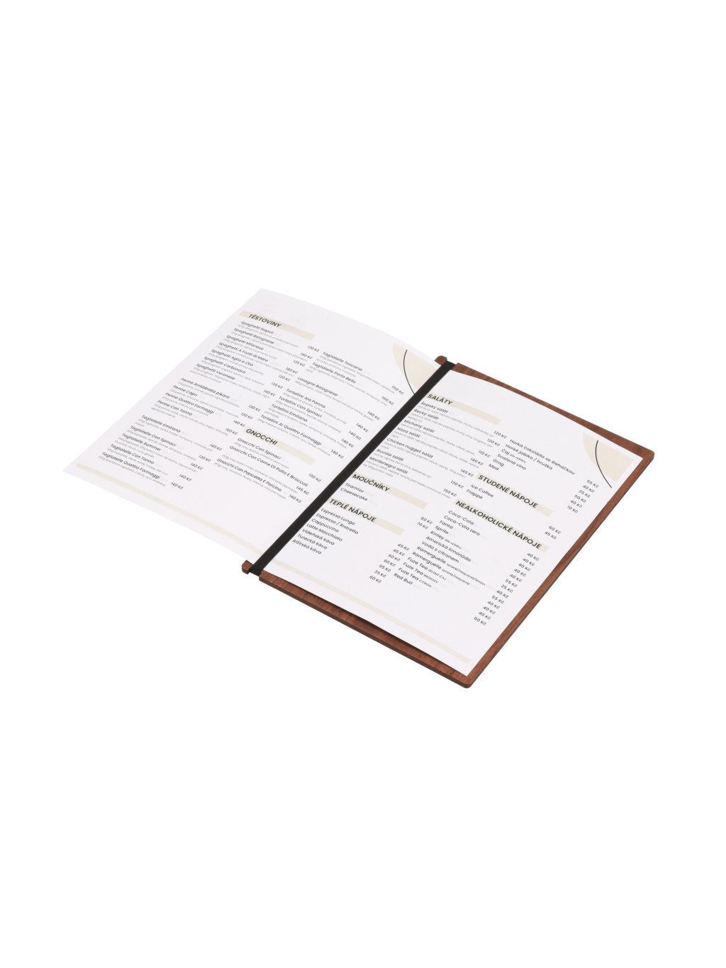 Jídelní lístek stačí vytisknout a vložit za pevnou gumu. Když se zašpiní nebo poškodí, mužete ho ihned vyměnit za nový, takže každý zákazník dostane elegantní kartu menu.