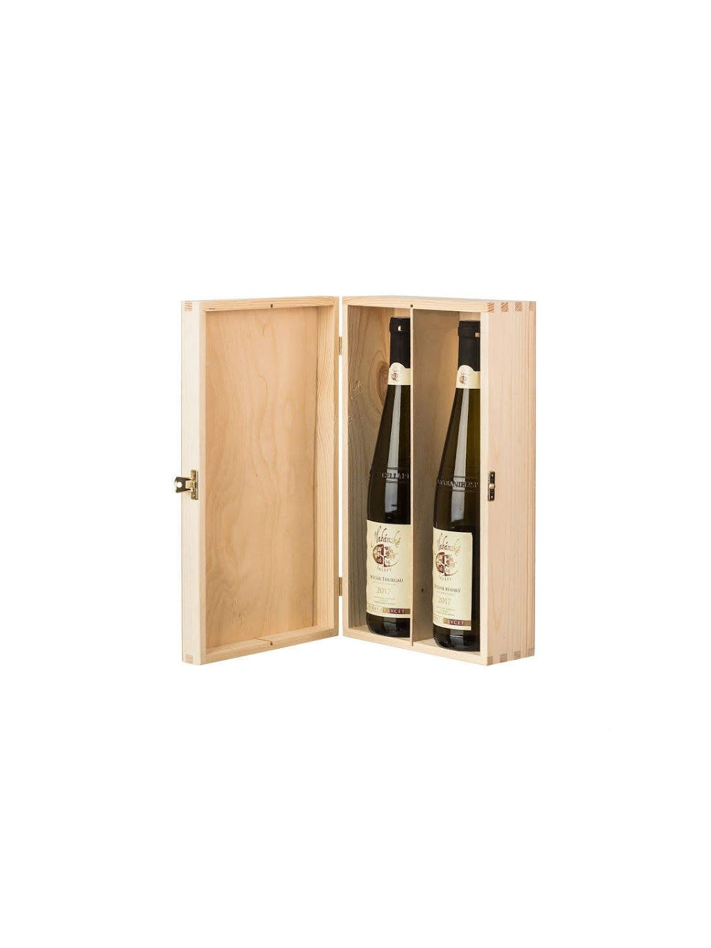 Velmi pěkně zpracovaná krabička na vína je vyrobena z borovicového dřeva a uvnitř je rozdělena na dvě přihrádky. Počet přihrádek už sám o sobě napovídá, jaký počet lahví vína se dovnitř vleze.