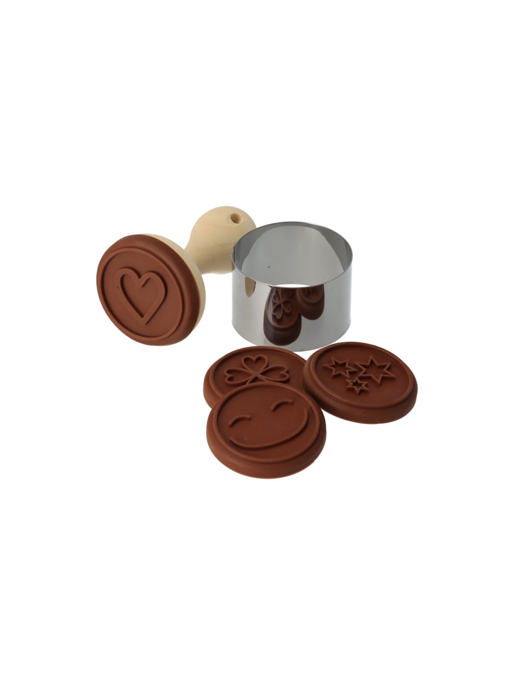 Ideální těsto pro tato razítka neobsahuje kypřící prášek, sodu či droždí, vytvořený reliéf tak zůstane dobře vidět i po upečení. Z těsta jednoduše vyválejte plát, vykrojte kolečko a na něj vytlačte reliéf razítkem, kterým těsto můžete rovnou přenést na plech.